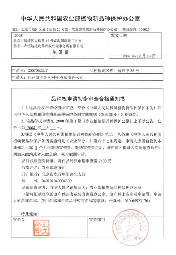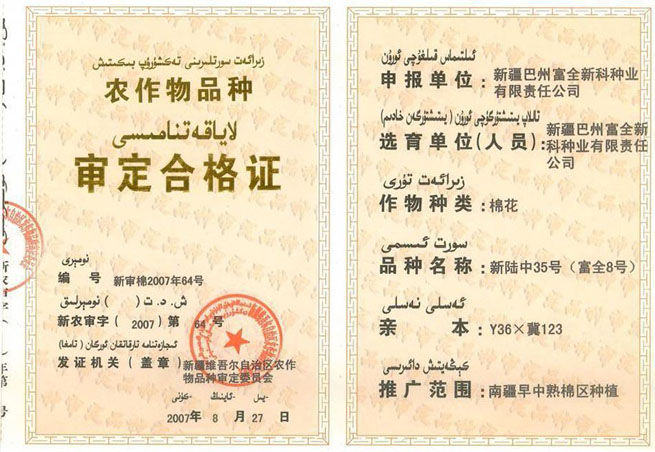 新陸中35號(富全8號)是新疆富全新科種業公司選育的早中熟陸地棉品種,于2007年通過品種審定。因該品種高產優勢明顯,市場假冒產品多,富全新科種業已申請國家品種保護。現由該公司控制所有原種資源。該品種2008年被列入自治區良種補貼推廣項目成為重點推廣的棉花品種。